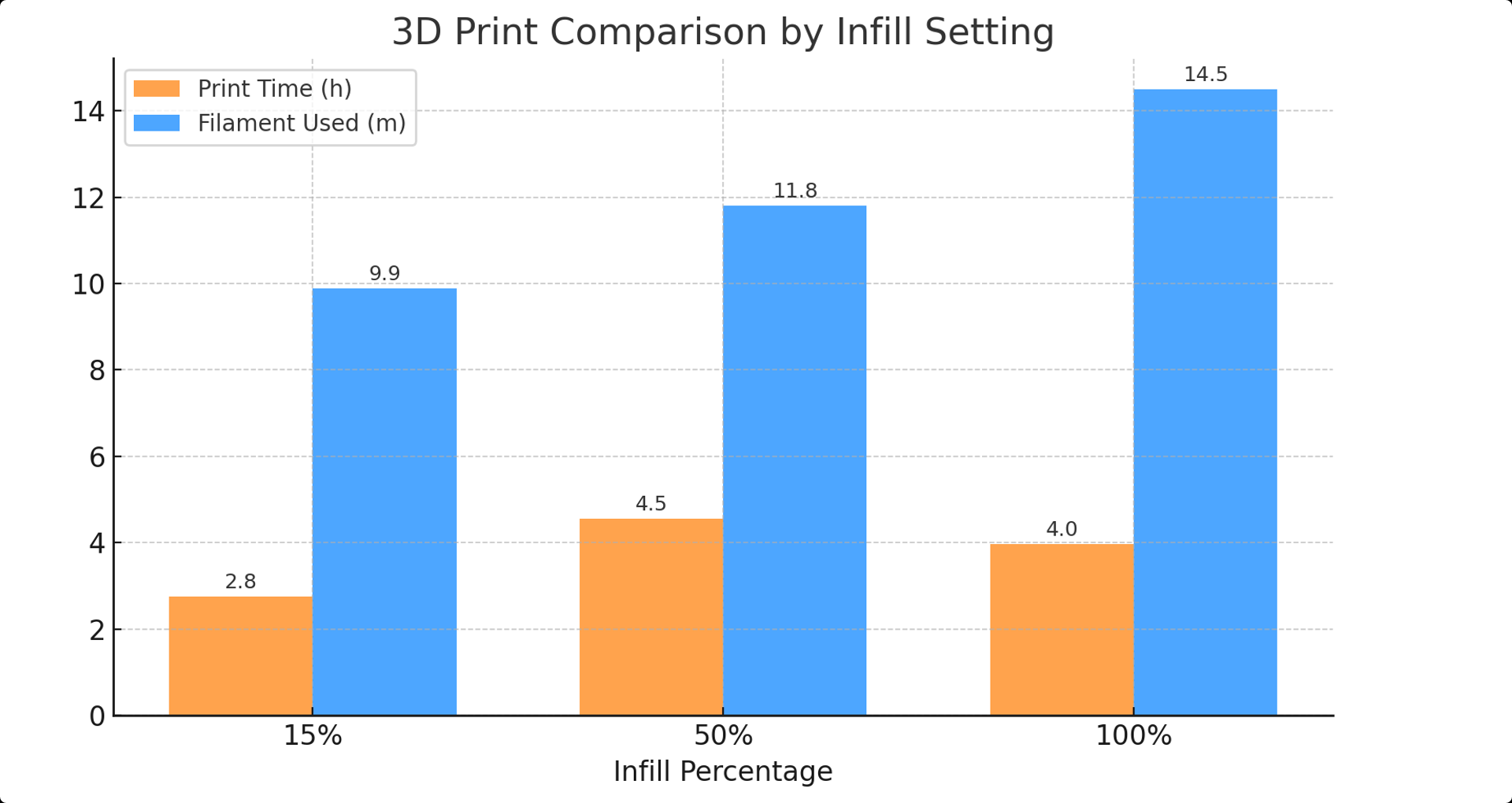 Bar chart comparing print time and filament used for 15%, 50%, and 100% infill settings. It shows that 100% infill uses the most material but doesn’t necessarily take the longest to print.