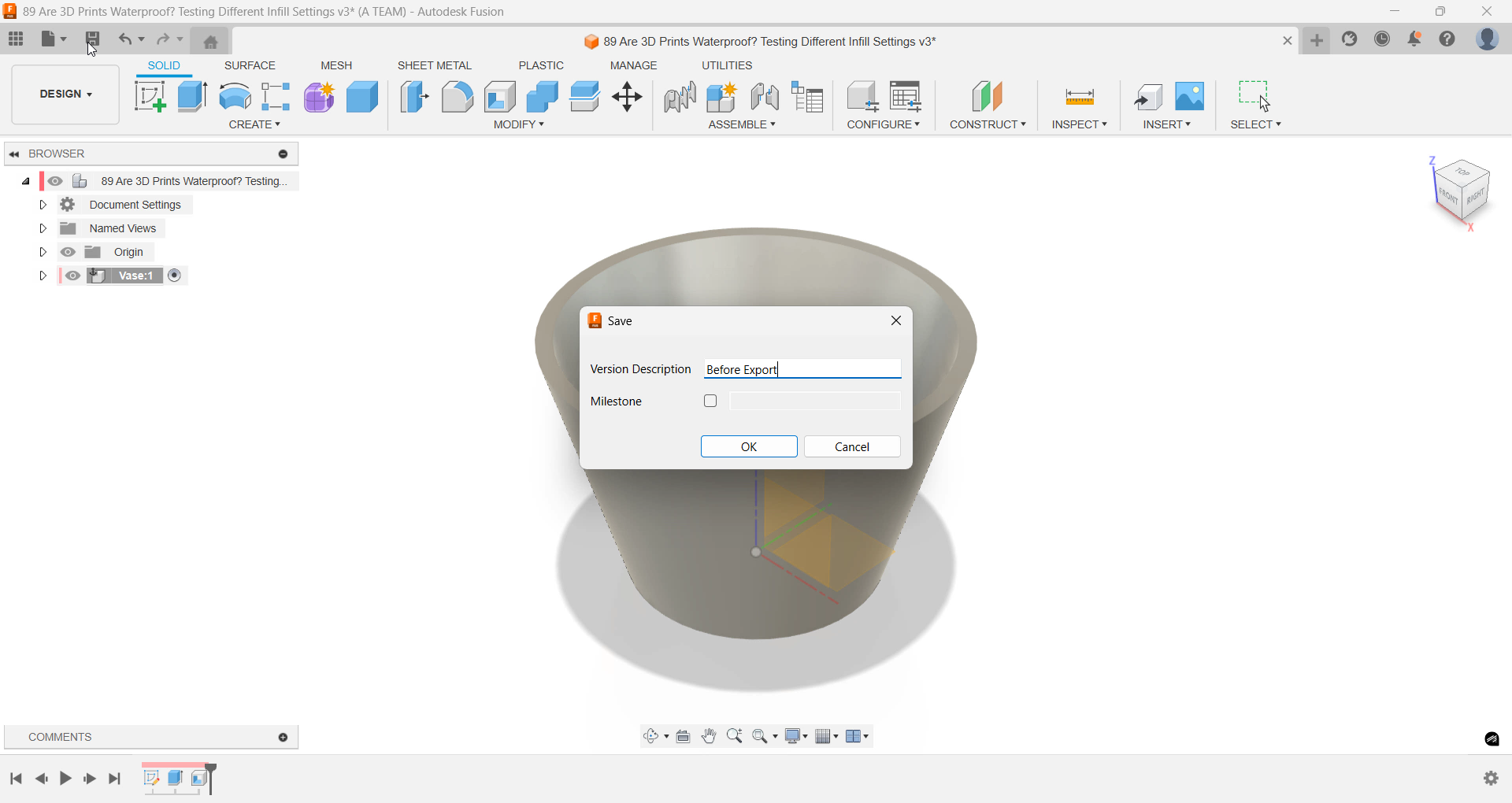 Autodesk Fusion interface showing the save dialog with a version description labeled “Before Export,” capturing the final step before exporting the vase model for 3D printing.