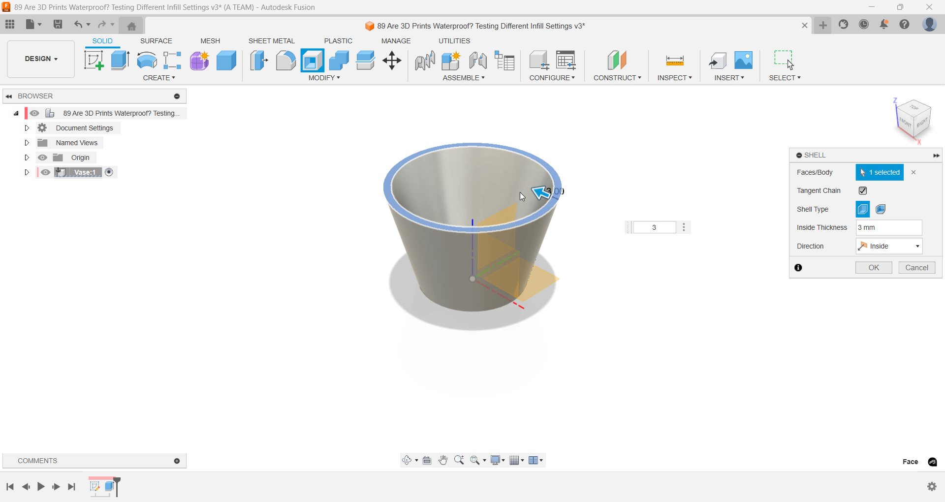 Autodesk Fusion workspace showing the Shell command being applied to a vase body. The top face is selected, and the inside thickness is set to 3 mm to hollow out the model while keeping the base solid.