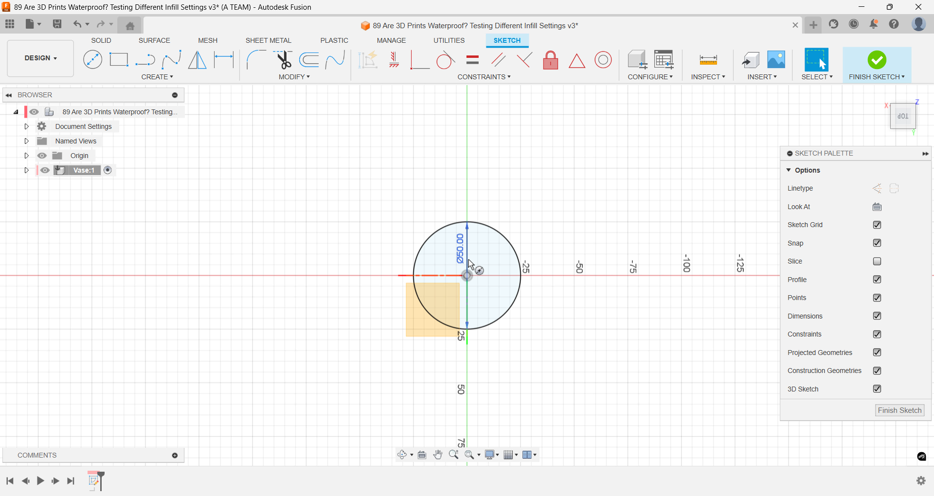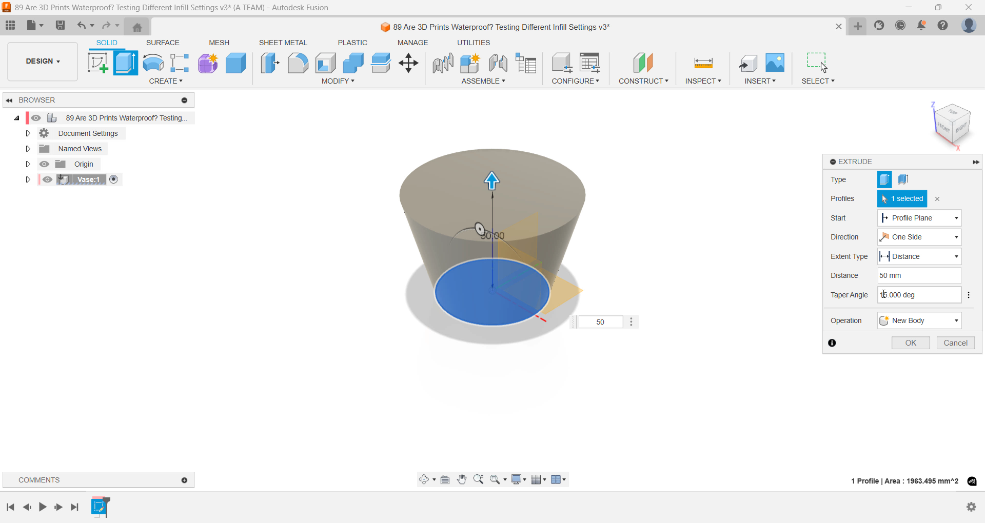 Autodesk Fusion workspace showing a top-plane sketch with a 50 mm diameter circle, defining the base of a vase model for a 3D printing test.