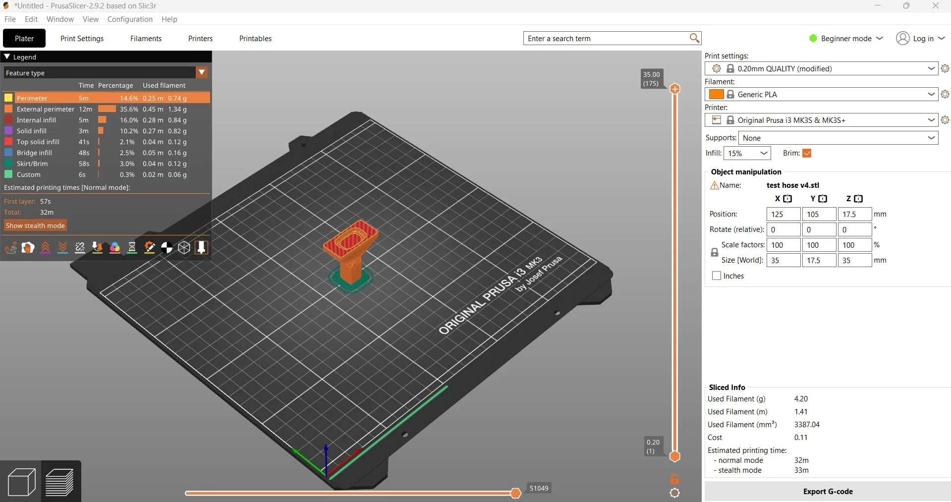 Open the STL in your slicer (PrusaSlicer in this example). Since the key has a small contact area with the build plate, add a brim to improve stability. I used the default quality preset and standard infill.