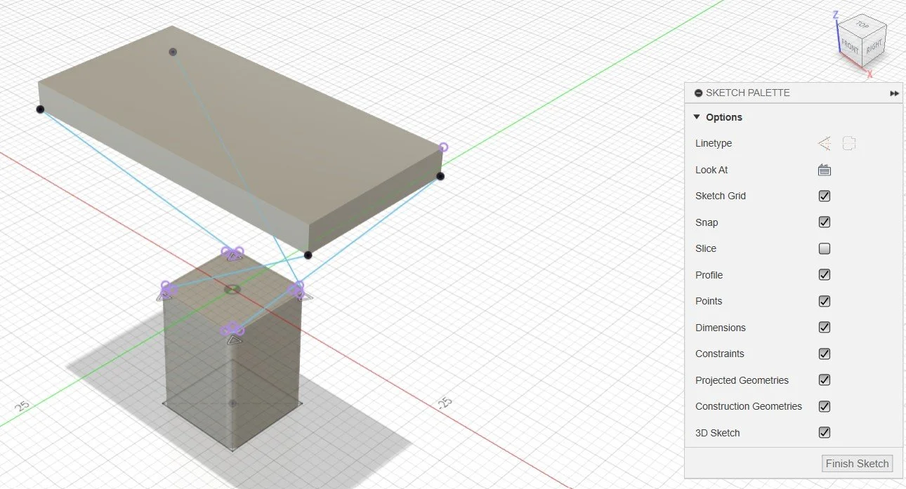 Now it’s time to connect the top and bottom. Activate 3D Sketch and draw guide rails on the vertical plane. Straight lines work for this project, but arcs or splines can give creative variations. Connect each filleted corner from the base to the top rectangle. Orbit the model as you go to check that all the lines snap correctly. Close the sketch once all four corners are connected.