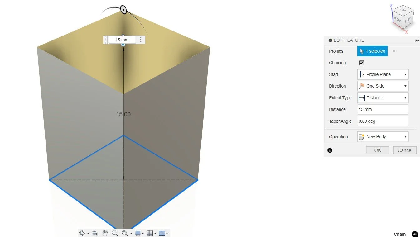 Jump directly into the Extrude command by pressing E and pull the sketch 3 mm downward toward the base.