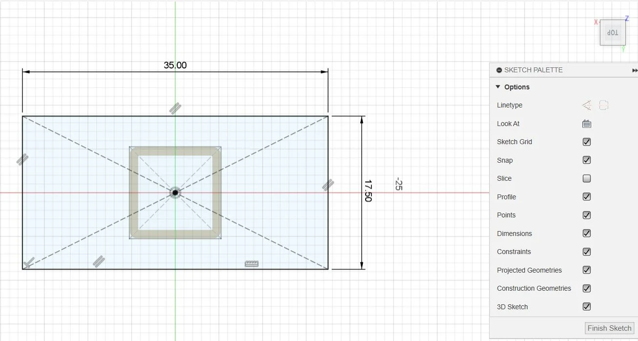 Set an offset plane 20 mm above the base and sketch another center rectangle, this time sized at 17.5 × 35 mm. Starting sketches from the origin makes adjustments easier later.